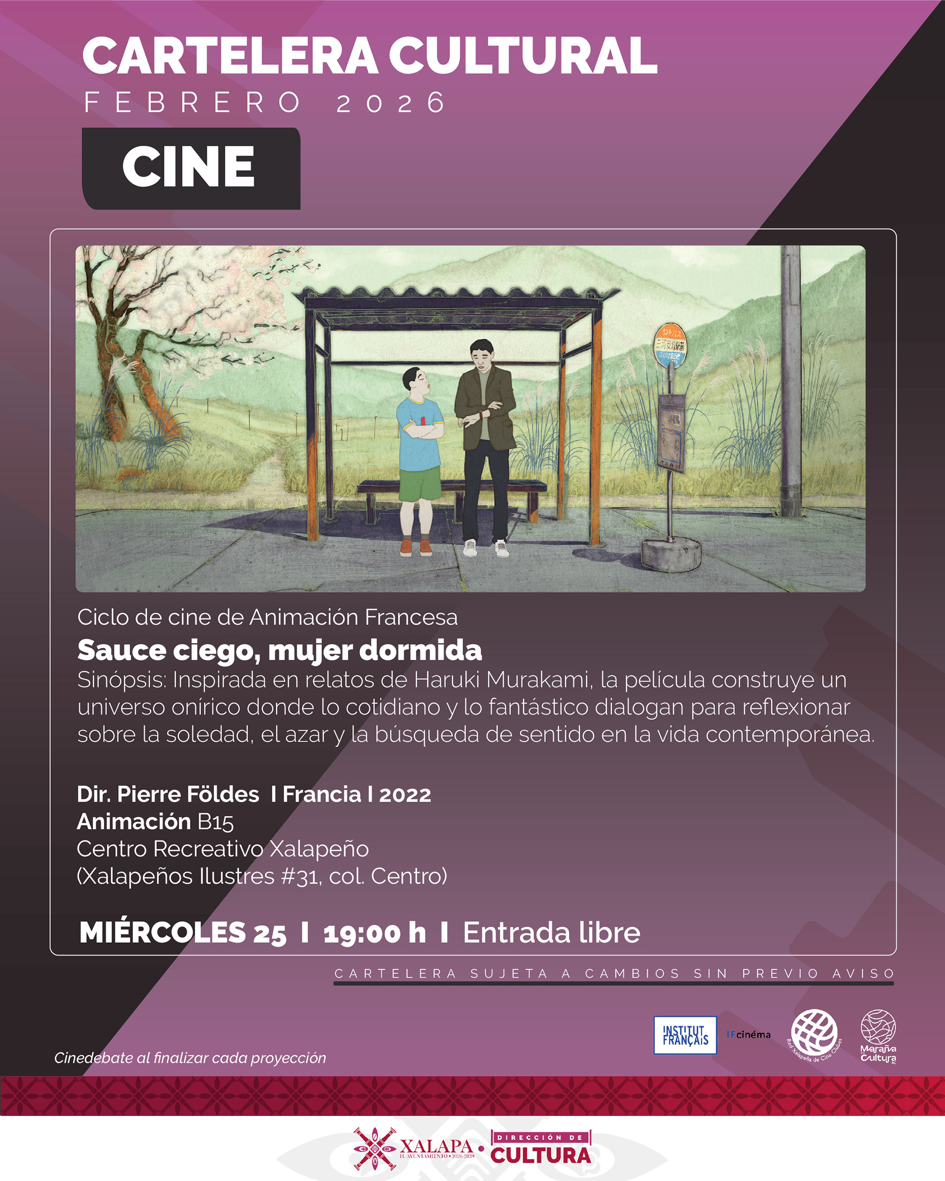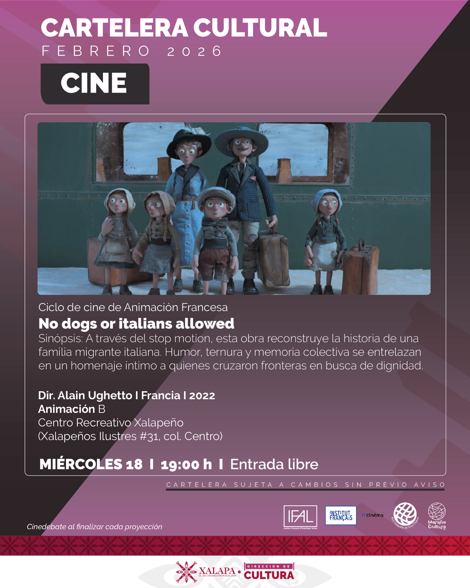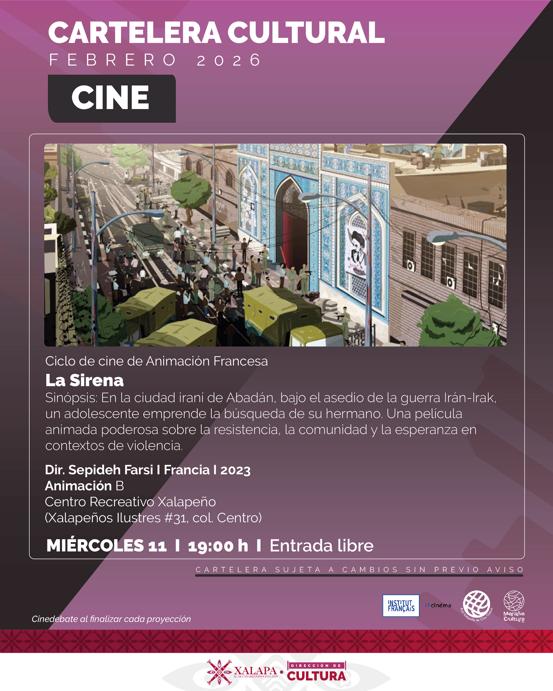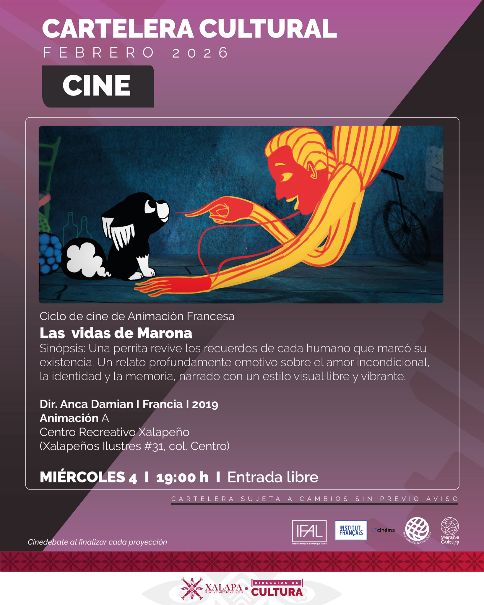 La Dirección de Cultura del Ayuntamiento de Xalapa, con el valioso apoyo del Instituto Francés de América Latina (IFAL), en colaboración con Maraña es Cultura A.C. y la Red Xalapeña de Cine Clubes, presenta el Ciclo de Cine de Animación Francesa, un ciclo que celebra la diversidad estética, temática y narrativa de una de las tradiciones animadas más sólidas e innovadoras del mundo.