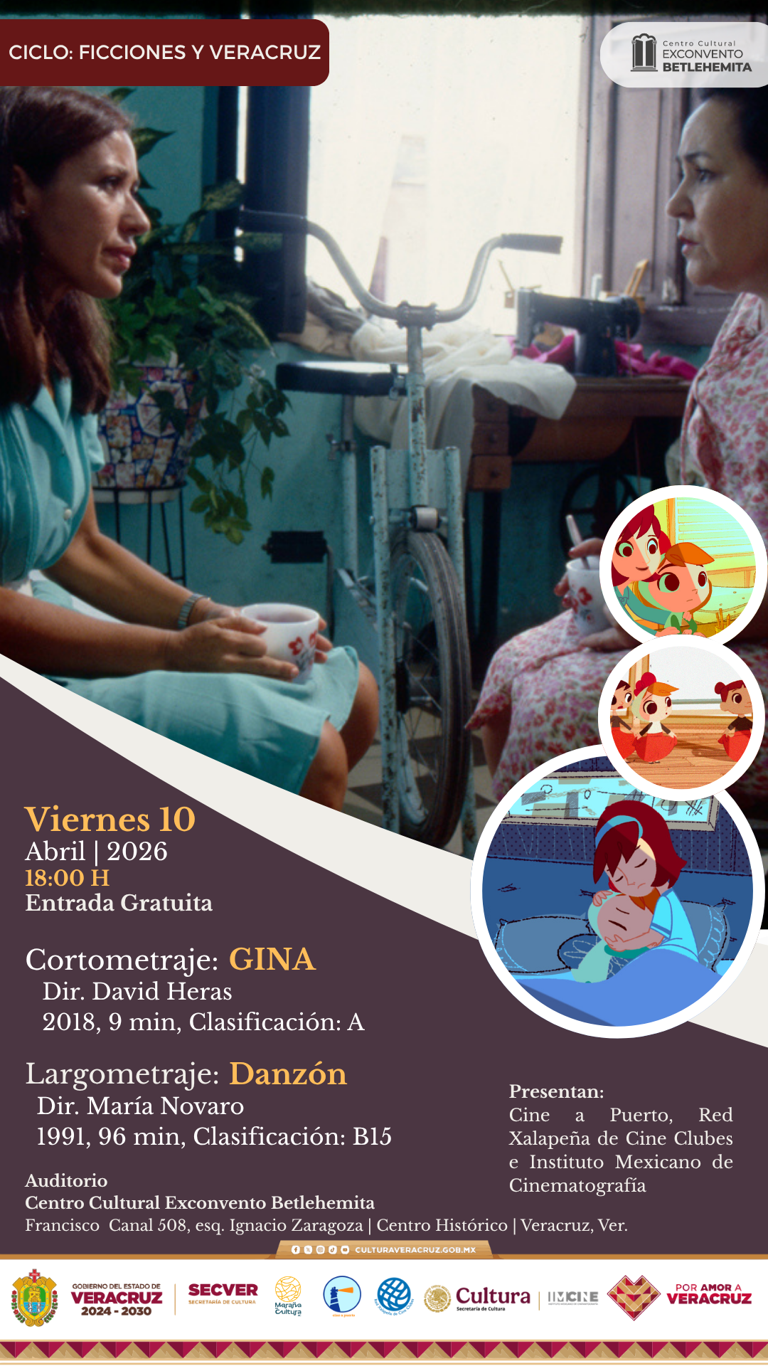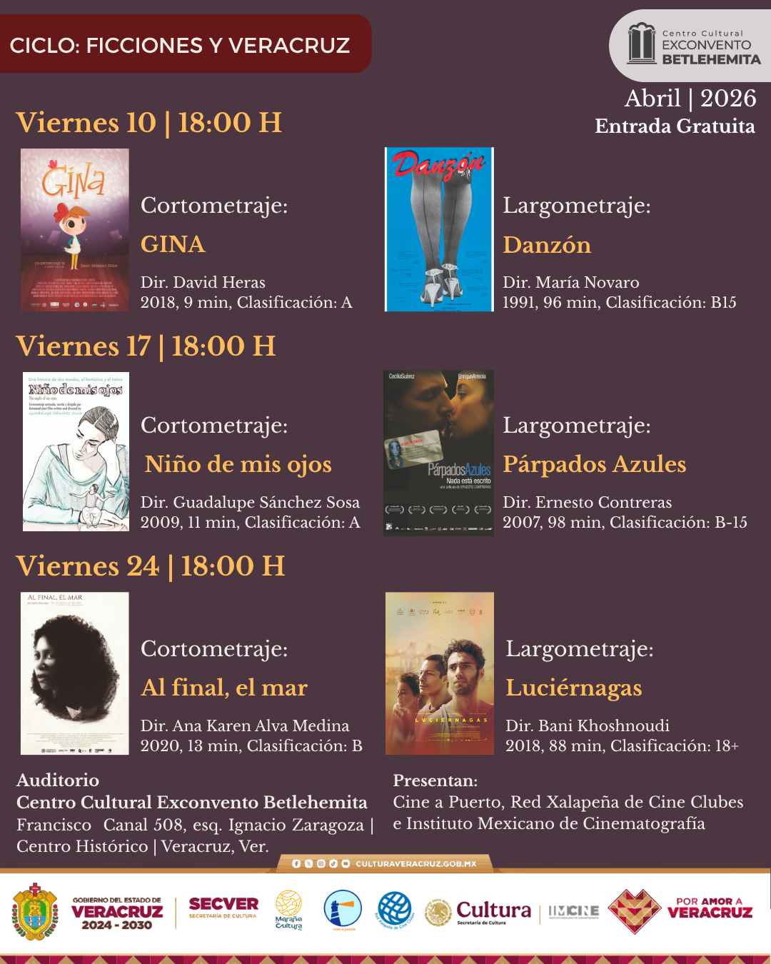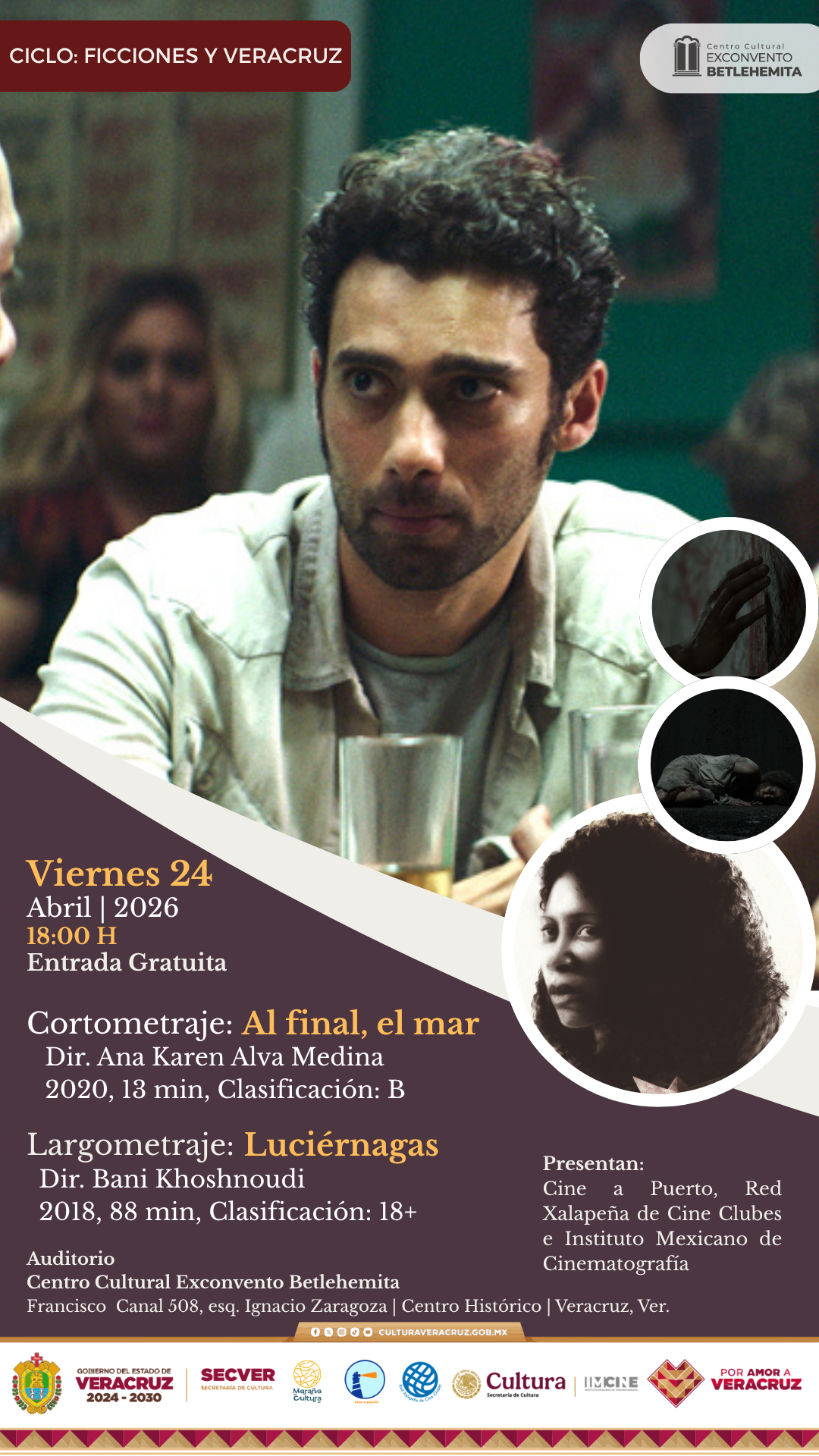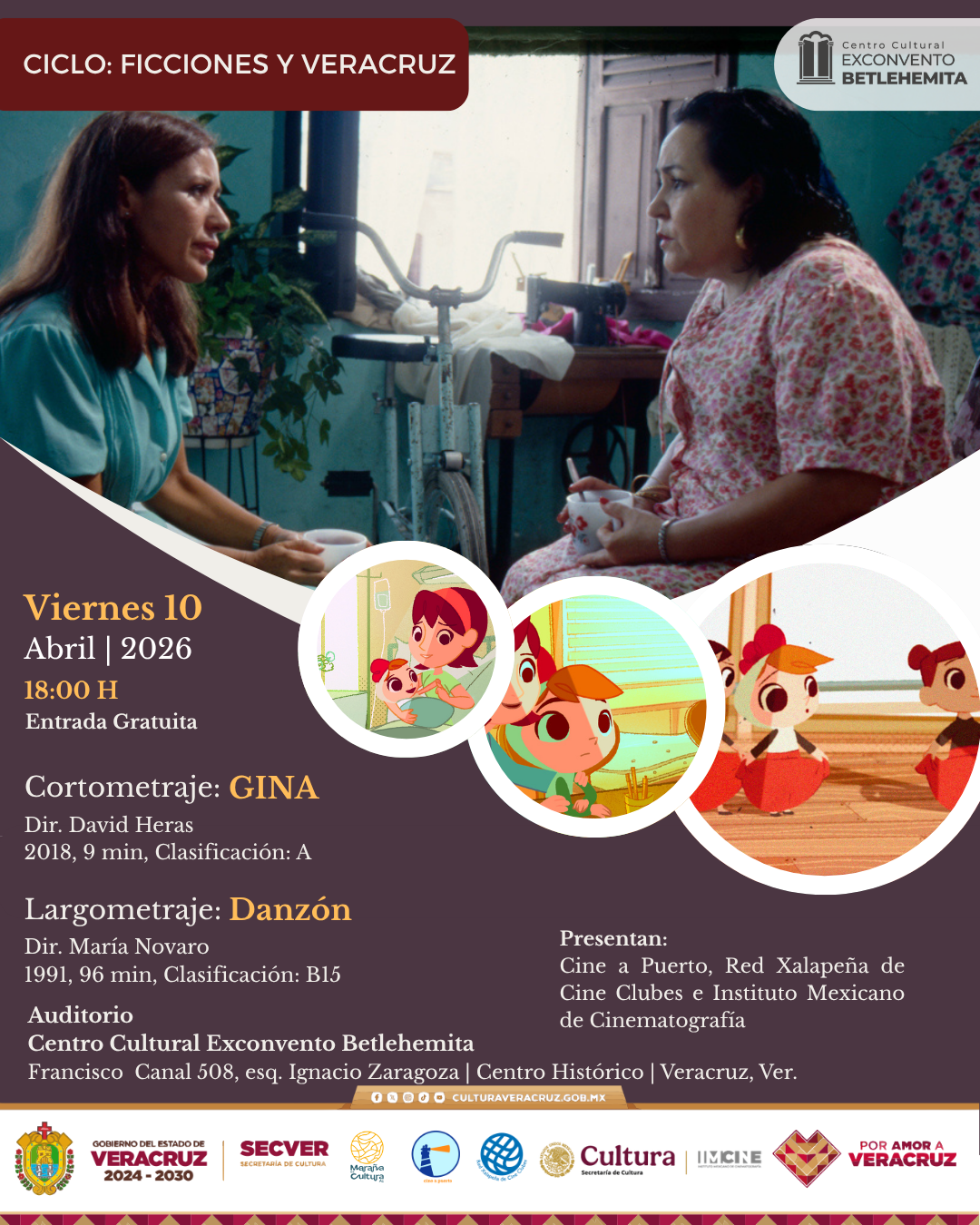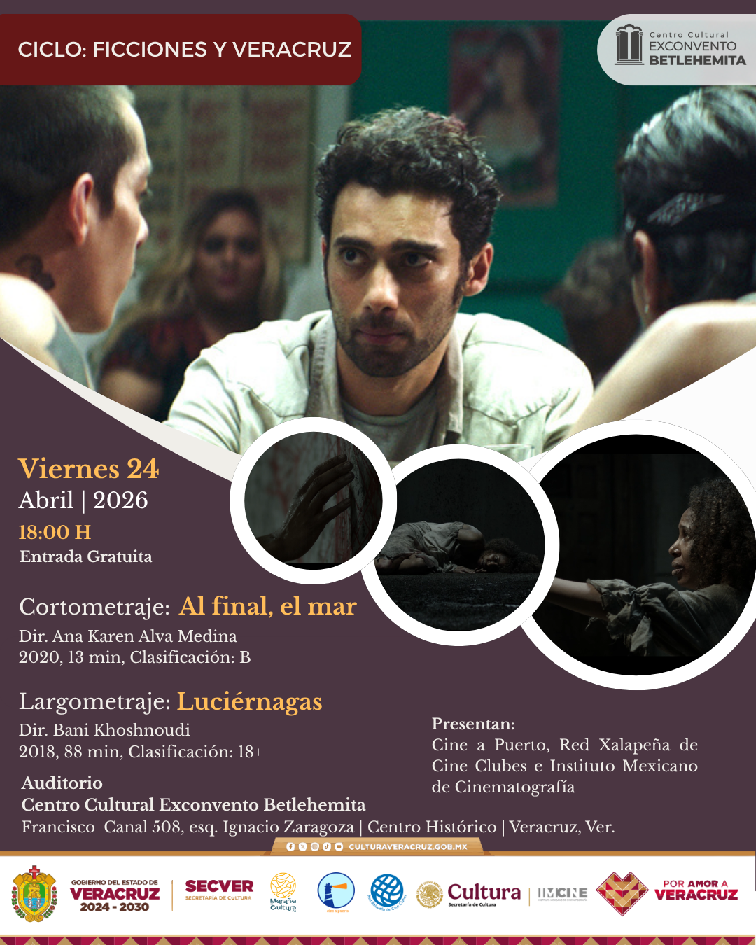 En abril el Cineclub Cine a Puerto con el acompañamiento del Instituto Mexicano de Cinematografía (IMCINE), la Secretaría de Cultura de Veracruz y el apoyo de la Red Xalapeña de Cine Clubes, Maraña es Cultura A.C. presentan el ciclo “Ficciones y Veracruz”, dentro del marco del aniversario del Exconvento Betlehemita, con una selección de cortometrajes y largometrajes premiados donde el puerto se vuelve un personaje más, donde la cultura es central, además de visiones de cineastas del estado. Una oportunidad para relacionarse con Veracruz desde diversas perspectivas.
