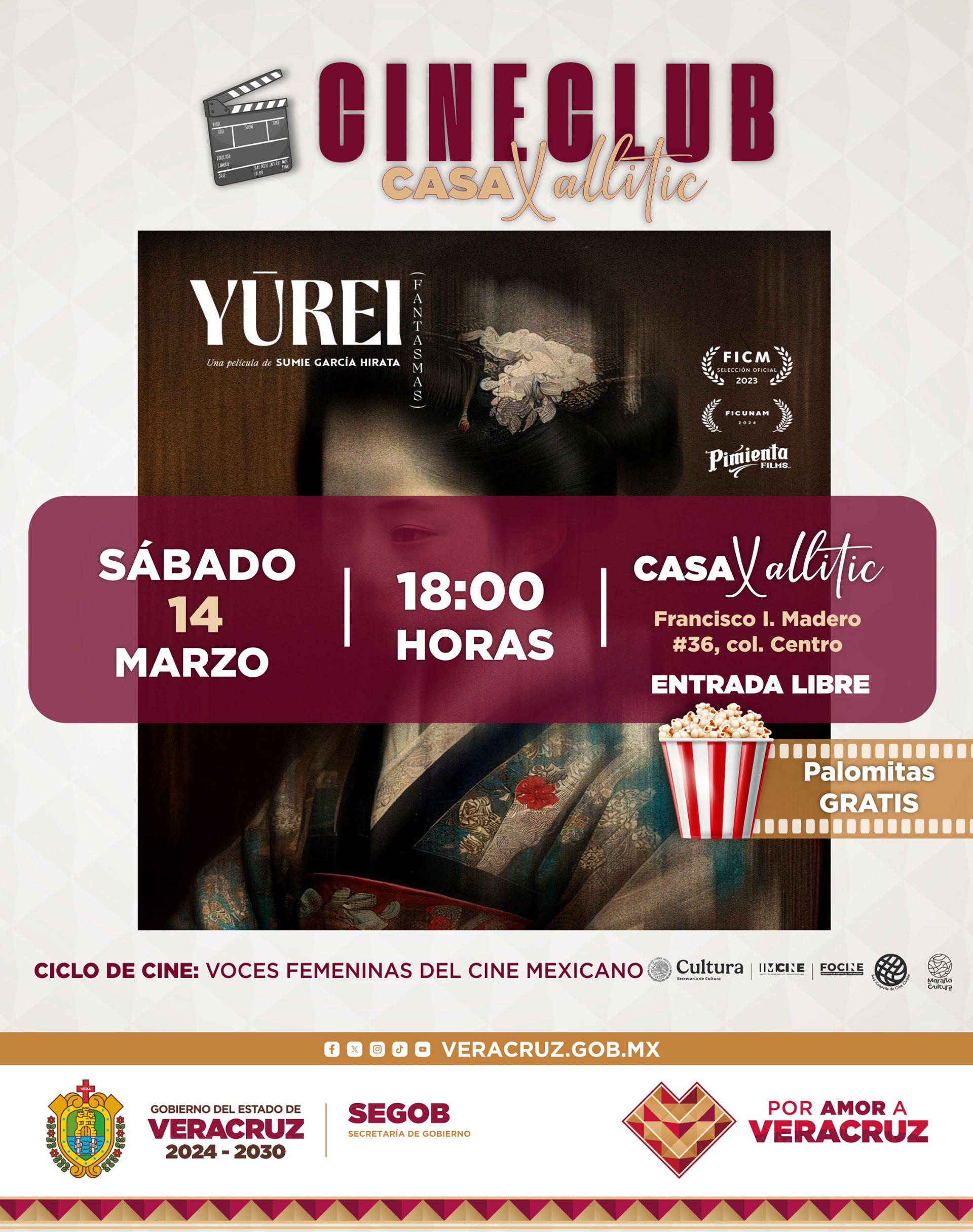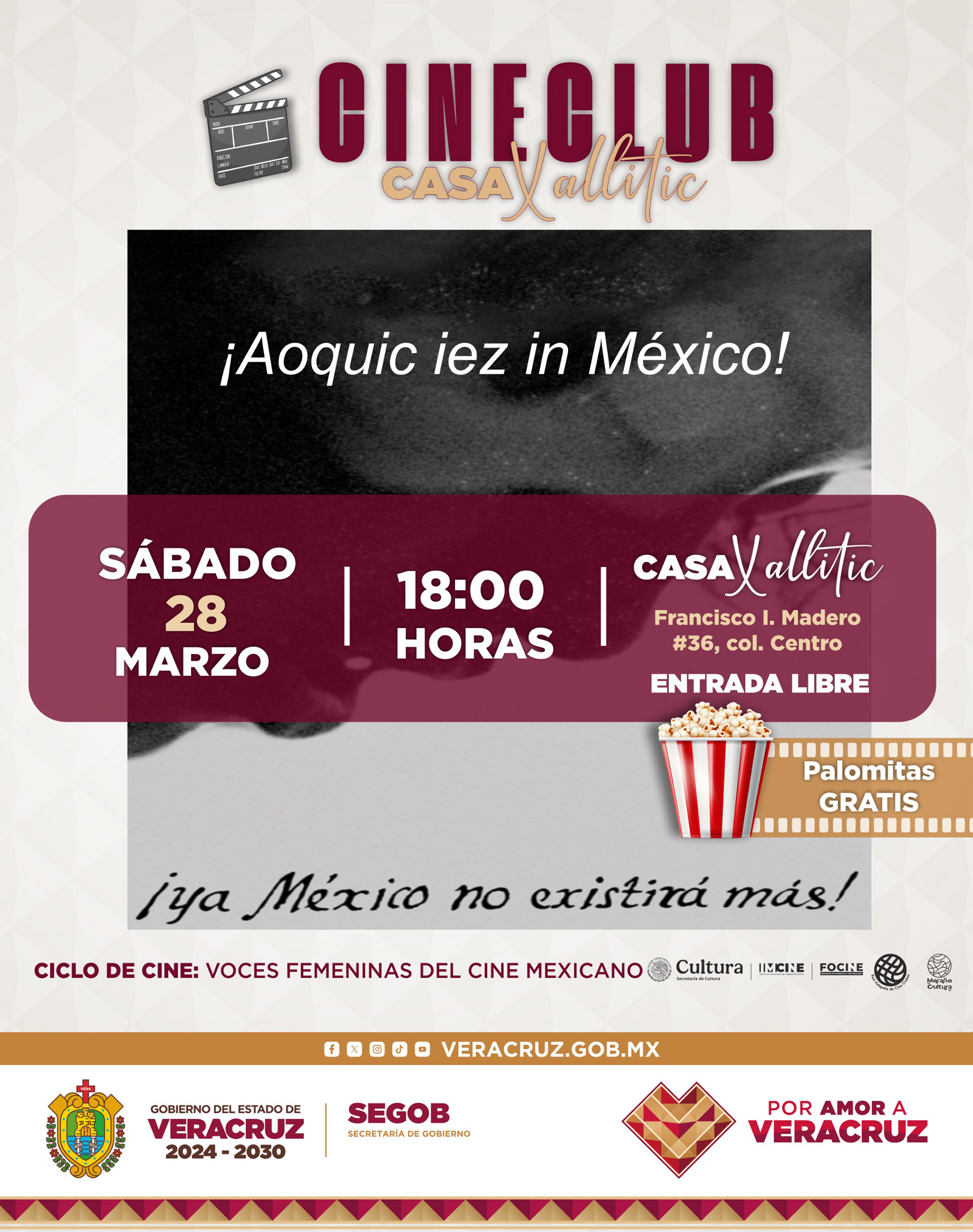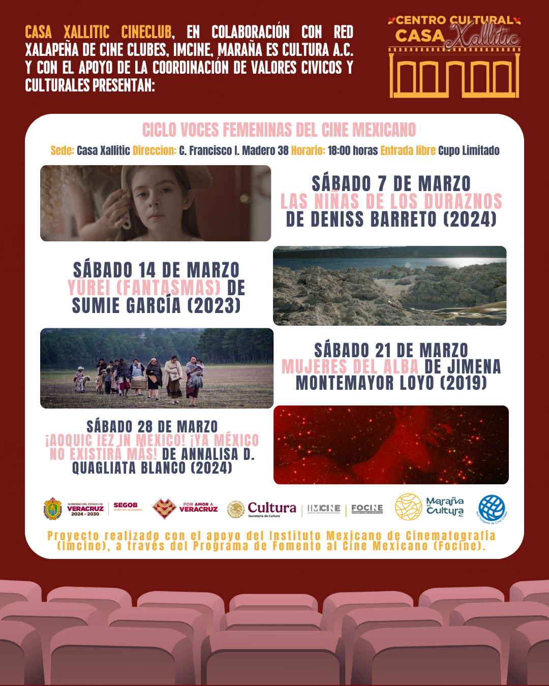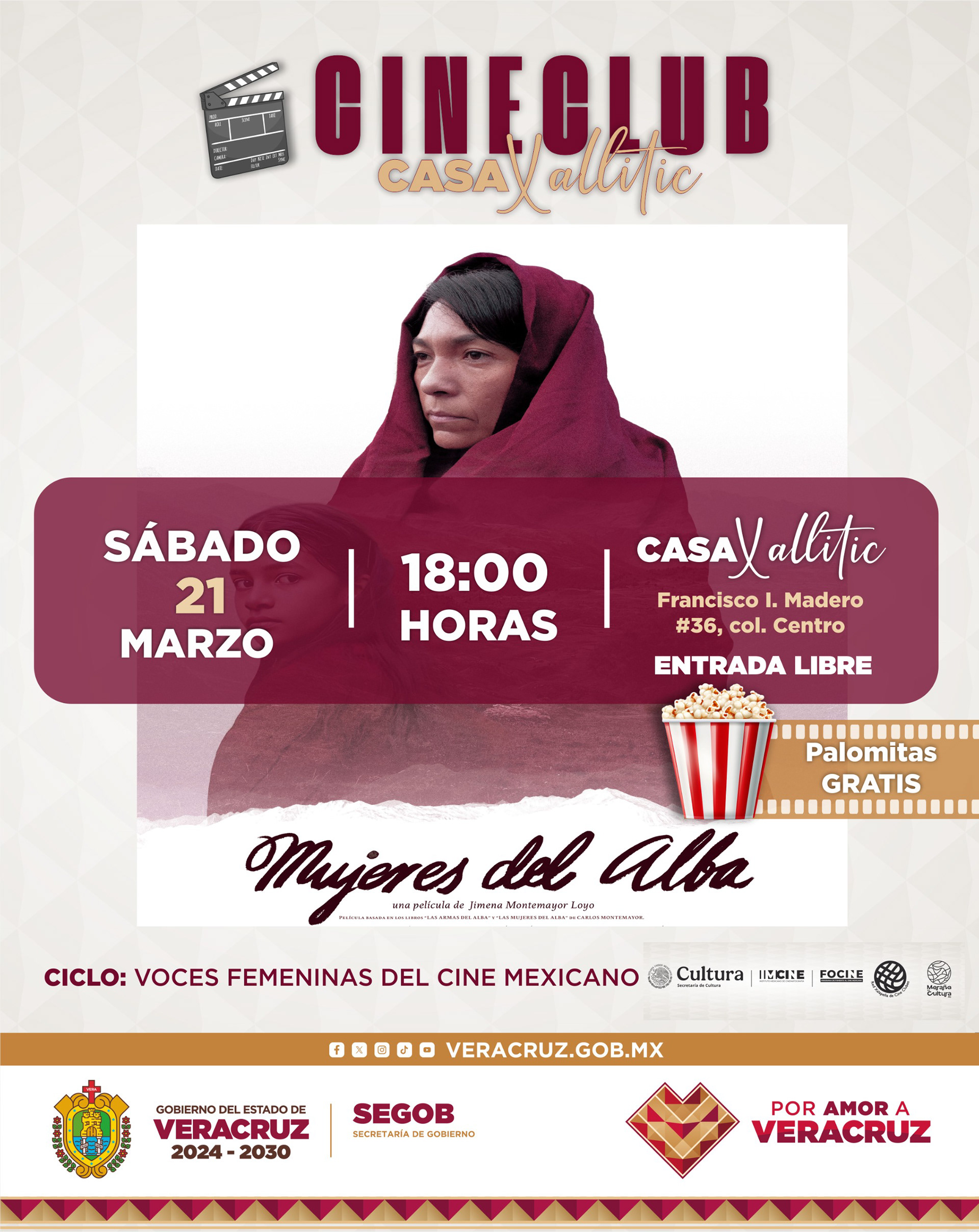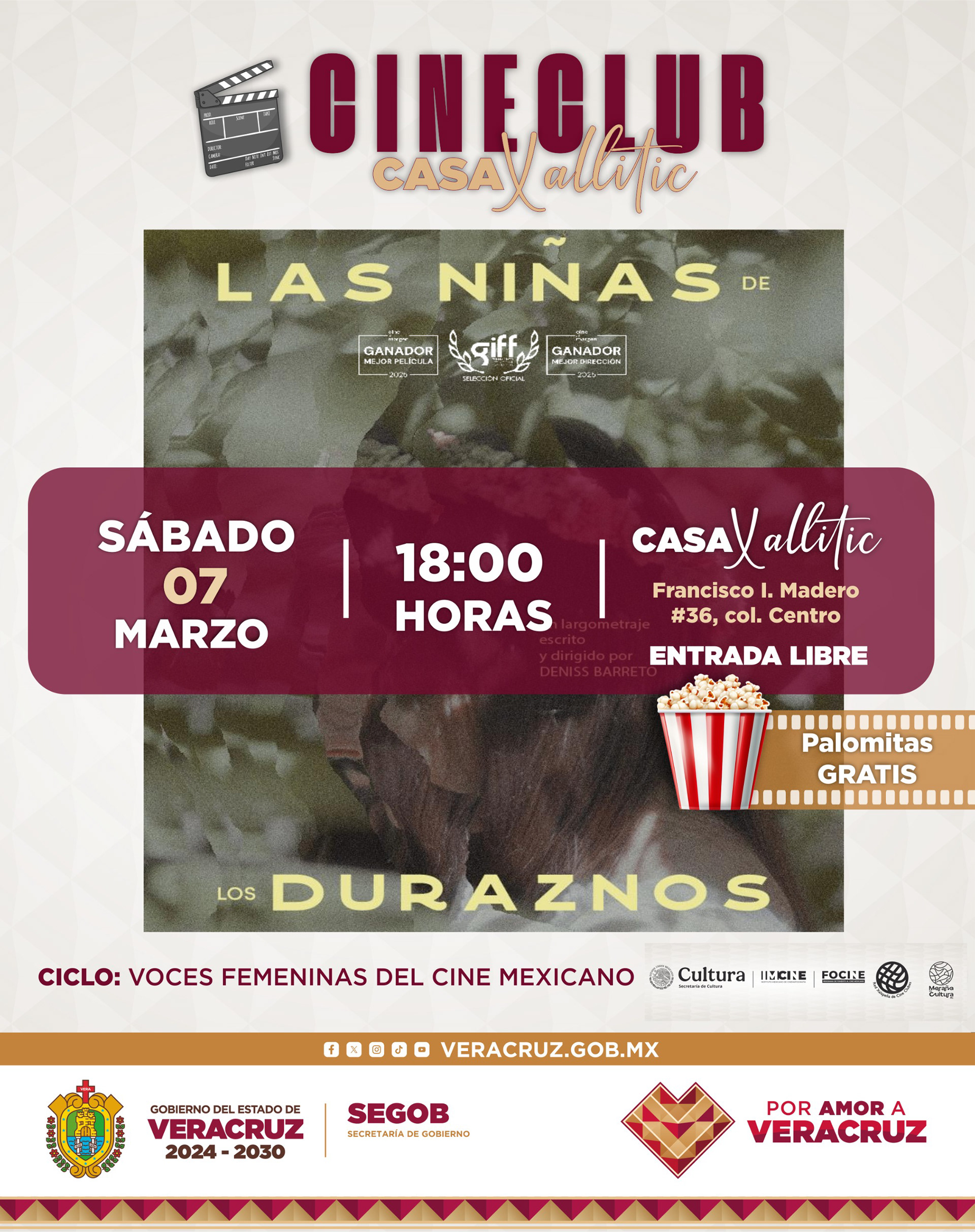 Casa Xallitic Cineclub, en colaboración con la Red Xalapeña de Cine Clubes, el Instituto Mexicano de Cinematografía (IMCINE), y con el apoyo de la Coordinación de Valores Cívicos y Culturales del Estado de Veracruz, Casa Xallitic y Maraña es Cultura A.C., invita al público a Voces femeninas del cine mexicano, un ciclo de funciones gratuitas que reúne cuatro películas dirigidas por cineastas contemporáneas cuyas miradas exploran la infancia, la memoria, la resistencia, la migración, el territorio y las fracturas de la identidad. 🌿🎥💫