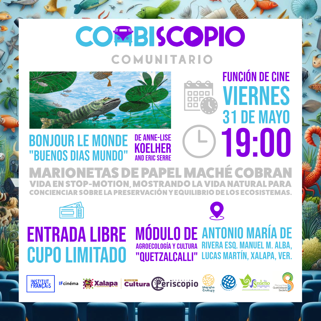 Periscopio Espacio, con el apoyo de Desarrollo Sustentable del Río Sedeño, Lucas Martín A.C., Parque Lineal Quetzalapan Sedeño, la dirección de Cultura del Ayuntamiento de Xalapa, la Red Xalapeña de Cine Clubes, Maraña es Cultura A.C. y el Instituto Francés de América Latina, se unen en una emocionante colaboración para la función del mes de mayo de "Combiscopio Comunitario" en el año 2024. Este evento tiene como objetivo principal proyectar películas para la niñez, así como fomentar la reflexión y la mediación en torno a temas sociales relevantes. Este mes se proyectará "Bounjour Le Monde" (Buenos días mundo) de Anne-Lise Koelher y Eric Serre.