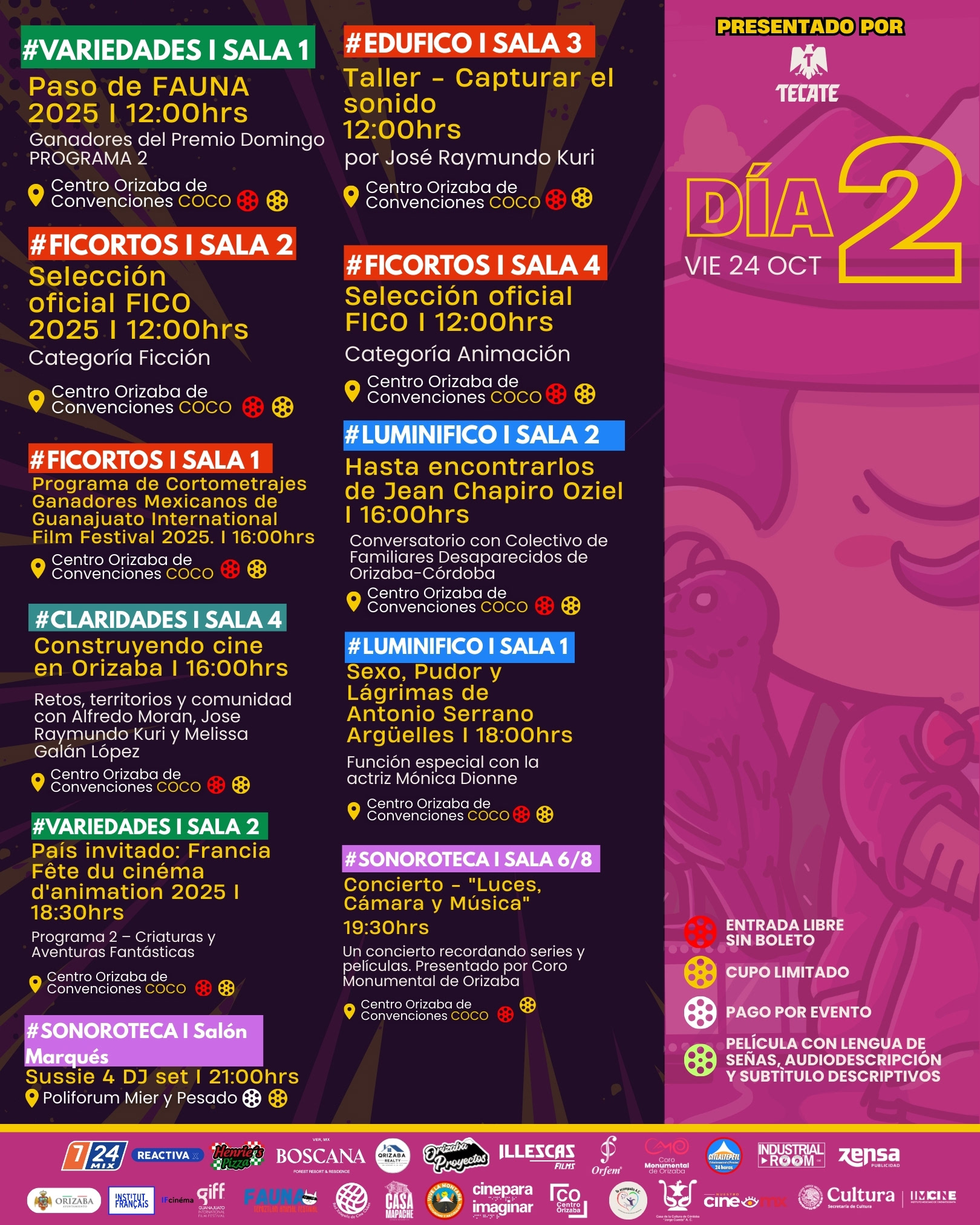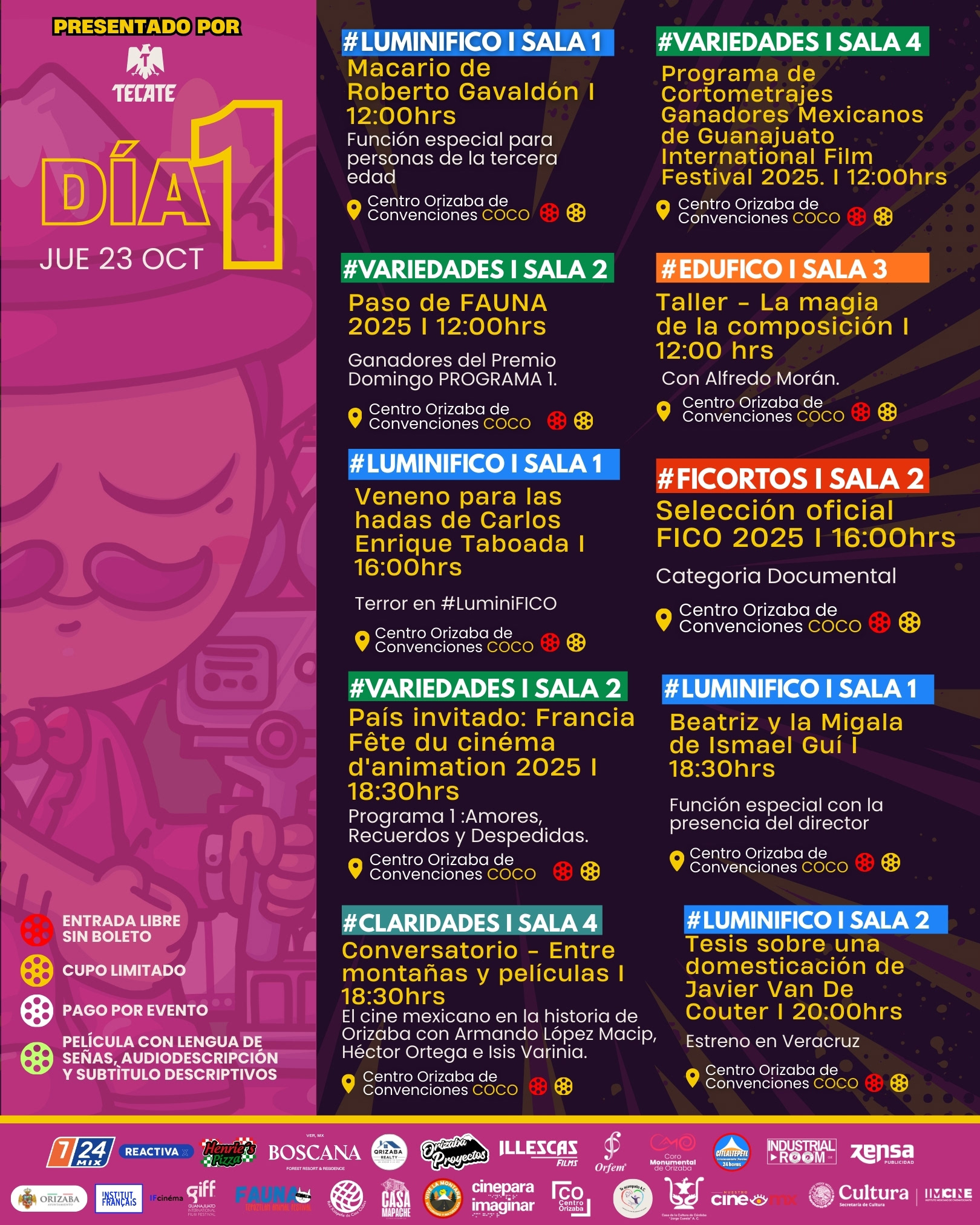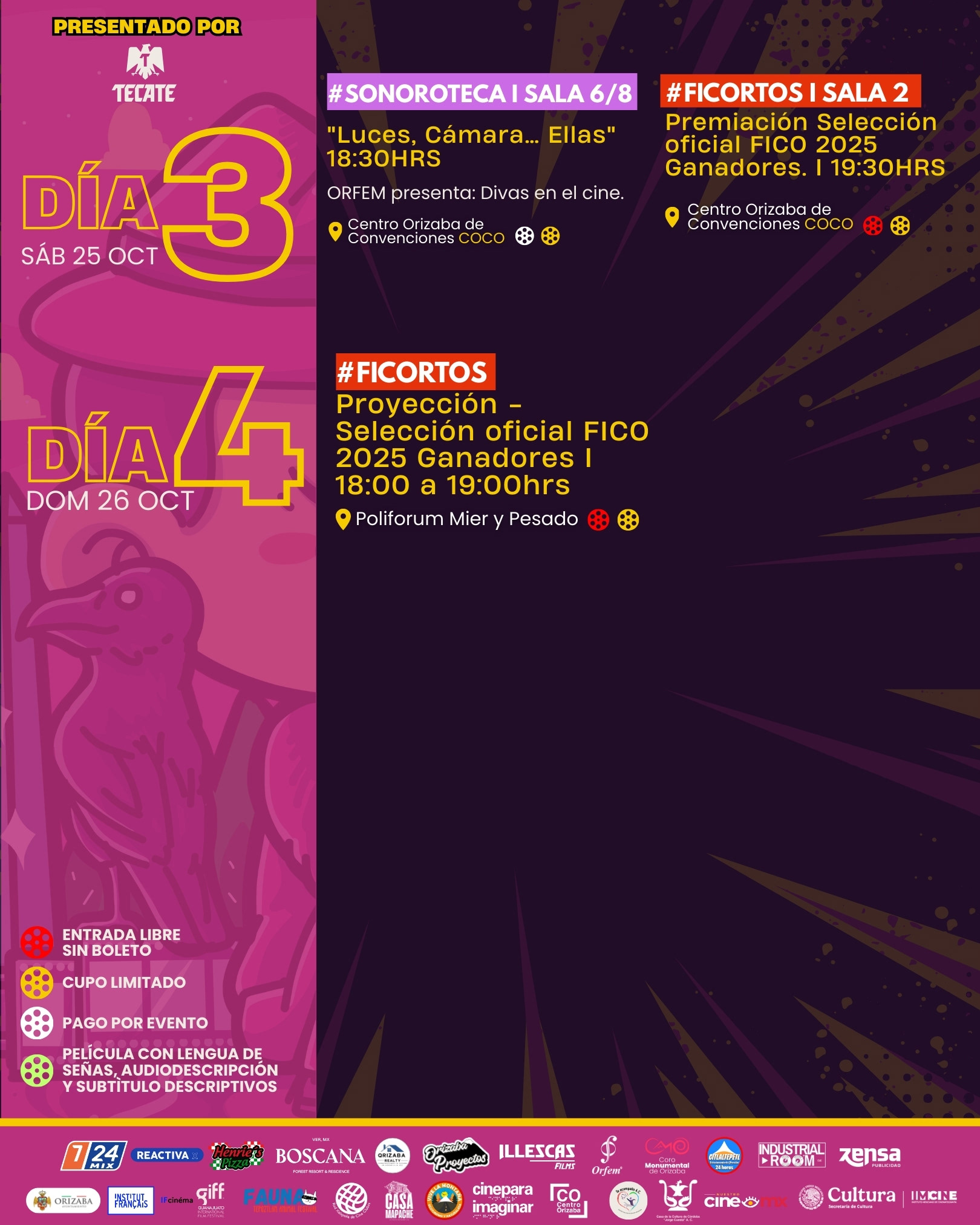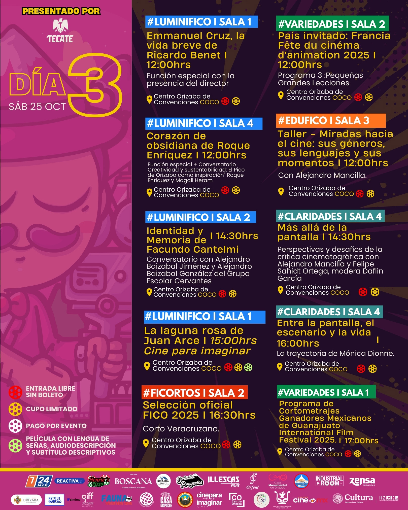 Como parte de la sección #Variedades, tendremos 2 festivales nacionales invitados: El Guanajuato International Film Festival con su Muestra Mexicana de Ganadores 2025 y dos programas de “Paso de FAUNA — Ganadores del Premio Domingo” del Tepoztlan Fauna Film Festival de Morelos. En el componente #LuminiFICO se anuncian funciones especiales con talento invitado y mediaciones: Macario, de Roberto Gavaldón (función para personas mayores, con apoyo de Cineteca Nacional); una función especial de terror Veneno para las hadas, de Carlos Enrique Taboada con apoyo de Instituto Mexicano de Cinematografía (IMCINE); la proyección del cortometraje Beatriz y la Migala, del director español Ismael Guí, residente de Orizaba; el documental Corazón de obsidiana, de Roque Enríquez, seguido del conversatorio "Creatividad y sustentabilidad: El Pico de Orizaba como inspiración" impartido por Roque Enríquez y Magali Heram; proyección especial del cortometraje nominado al Ariel, Hasta encontrarlos, de Jean Chapiro Oziel, con diálogo junto al Colectivo de Familiares de Desaparecidos de Orizaba-Córdoba; una función especial del documental Emmanuel Cruz, la vida breve, presentado por el cineasta Ricardo Benet; también la proyección del documental Identidad y Memoria, de Facundo Cantelmi, en colaboración con el Grupo Escolar Cervantes de la ciudad de Córdoba. La programación suma una función accesible de La laguna rosa (Cine para Imaginar), con interpretación en Lengua de Señas Mexicana (LSM), audiodescripción y subtitulado descriptivo, y contará con la presencia del director Juan Arce y de Mónica Arce, la actriz protagonista con síndrome de Down ganadora de más de 12 premios por su actuación.