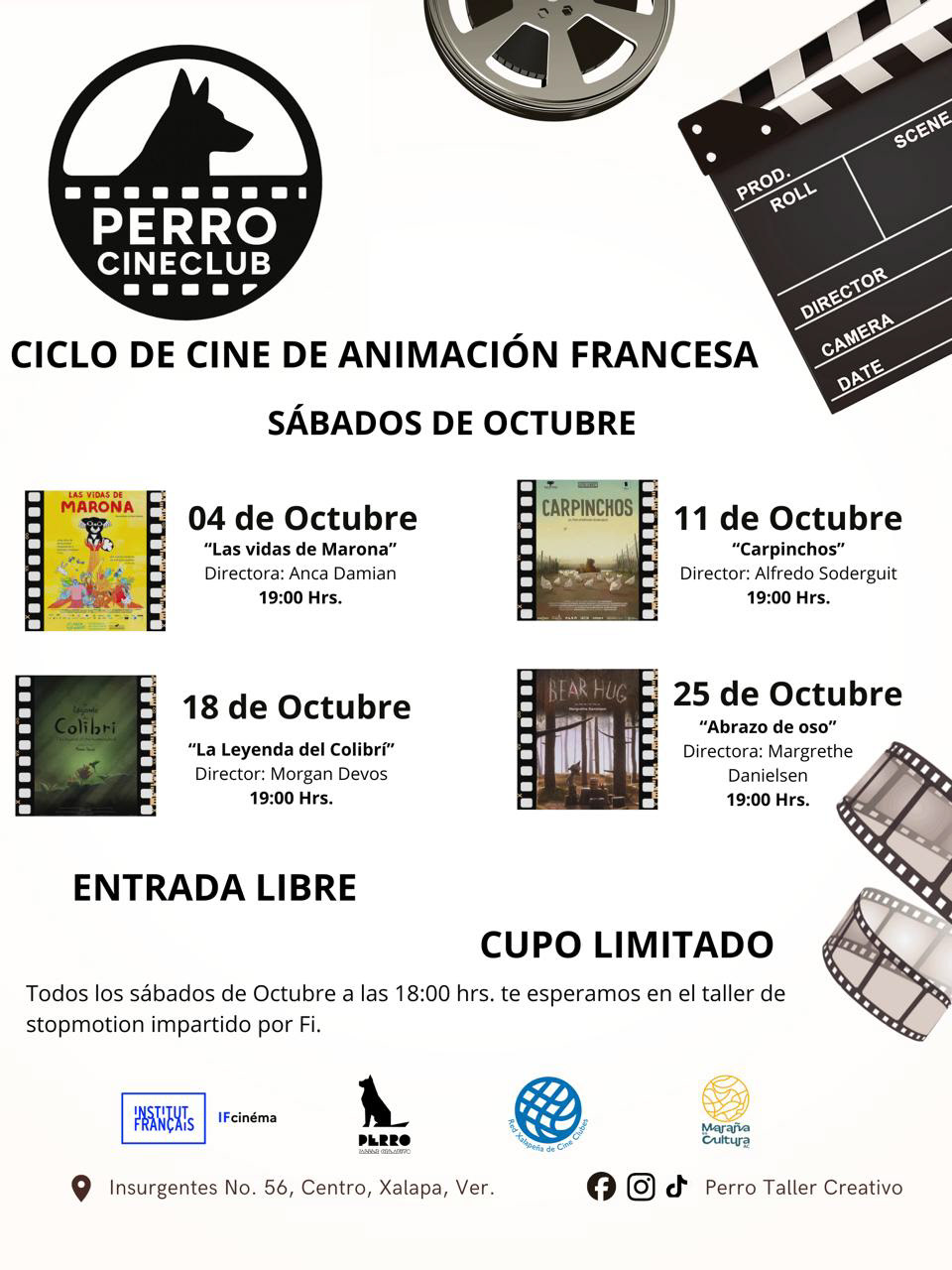 Xalapa, Ver.— Perro Cineclub abre sus puertas en el Centro de la ciudad con una propuesta dedicada íntegramente al cine de animación. Como actividad inaugural, presenta durante todos los sábados de octubre el “Ciclo de Cine de Animación Francesa”, con funciones gratuitas y cupo limitado, gracias a la colaboración del Instituto Francés de América Latina (IFAL), la Red Xalapeña de Cine Clubes y Maraña es Cultura A.C.