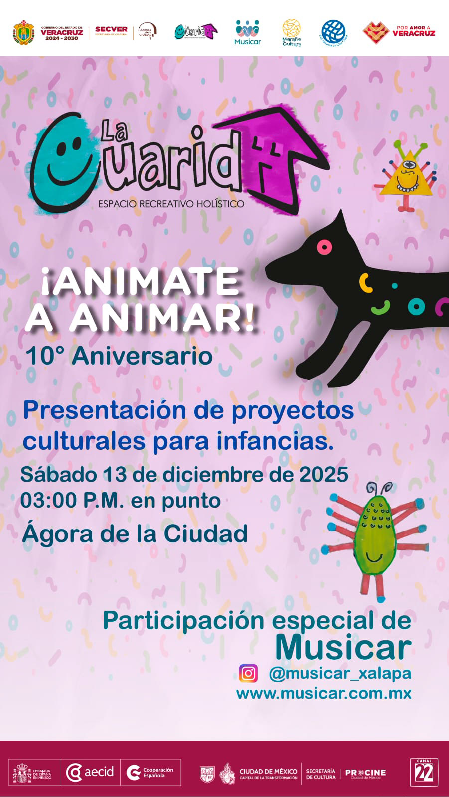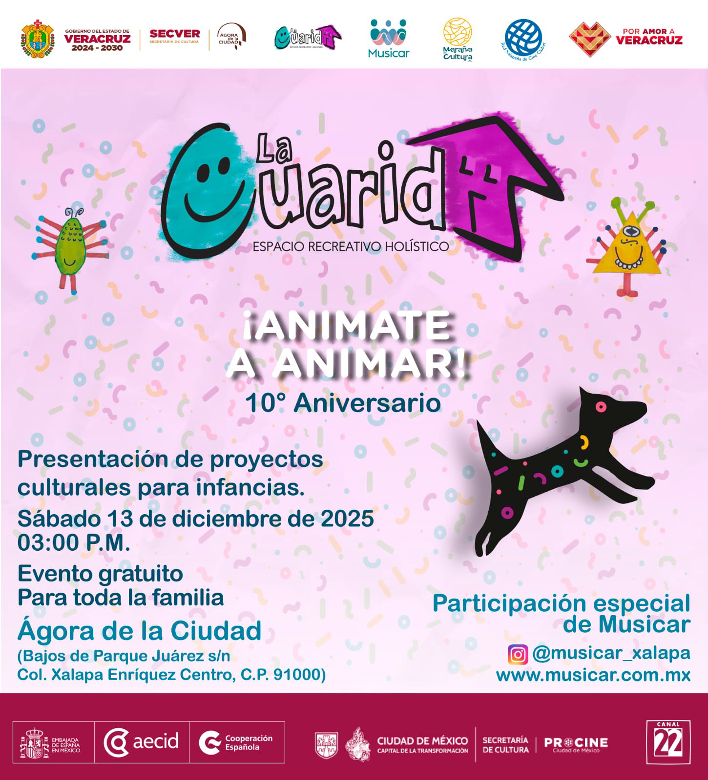La cita es en el Ágora de la Ciudad en Bajos del Parque Juárez s/n Xalapa Centro, el próximo sábado 13 de diciembre a las 3:00 p.m., abriendo y dirigiendo el evento las y los artistas de MUSICAR, siguiendo con la proyección de cortometrajes originales de la décima edición 2025 de ¡ANIMATE A ANIMAR! Así como la proyección especial del cortometraje DESENCHUFADOS, creado por las infancias de La Guarida Club de la Amistad. ¡Será un evento memorable, les esperamos!