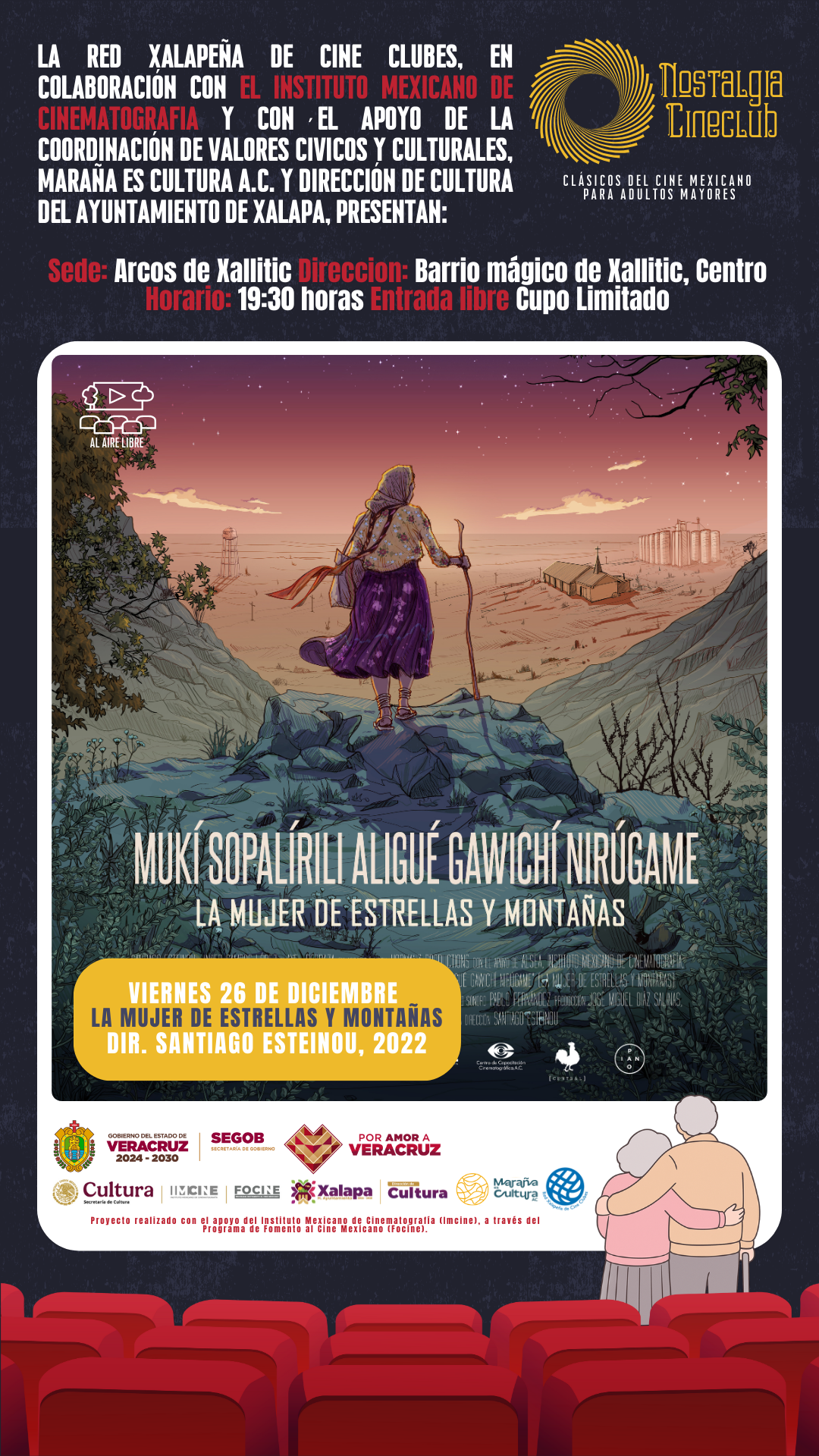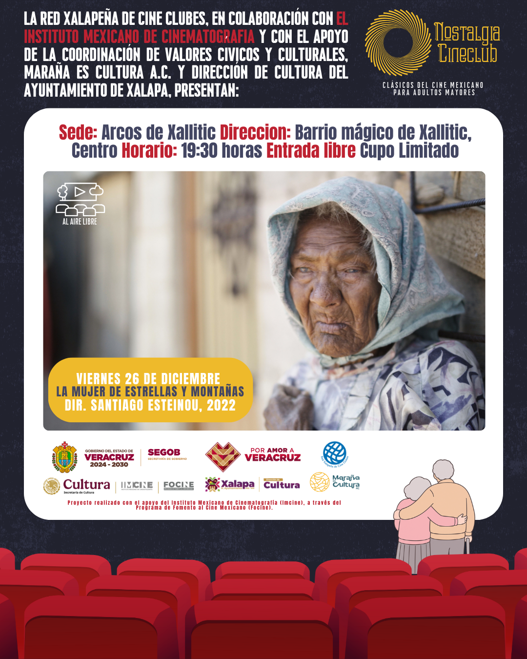 La Red Xalapeña de Cine Clubes, en colaboración con el Instituto Mexicano de Cinematografía (IMCINE) y con el apoyo de la Coordinación de Valores Cívicos y Culturales, Maraña es Cultura A.C. y la Dirección de Cultura del Ayuntamiento de Xalapa, invita a la función especial de La mujer de estrellas y montañas (Dir. Santiago Esteinou, 2022), como parte del ciclo Nostalgia Cineclub: Clásicos del Cine Mexicano para Adultos Mayores.